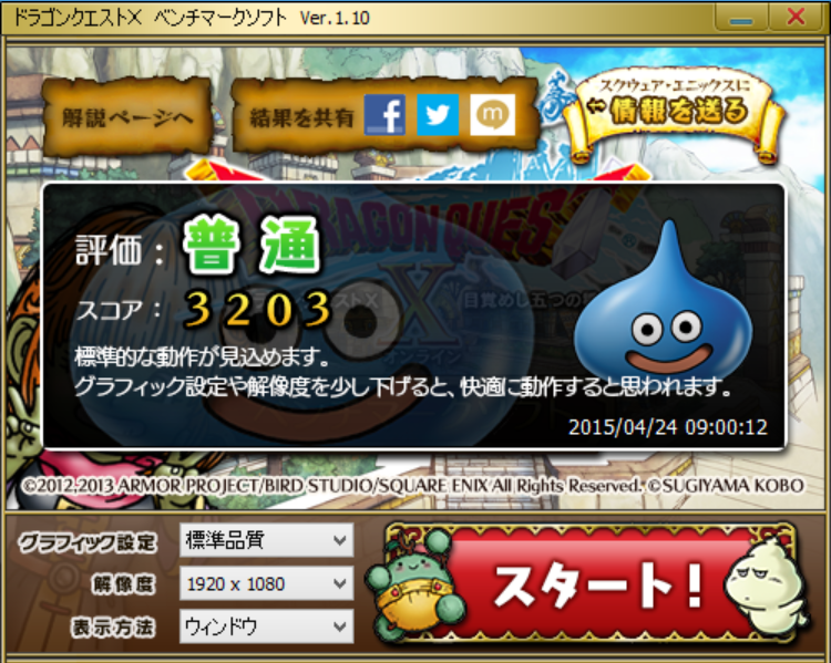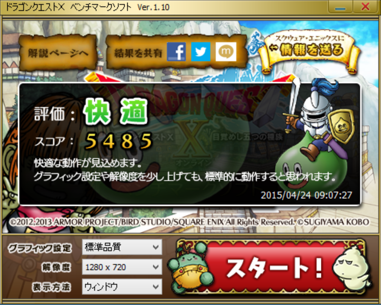 GH77/Tは、いわゆるゲーミングPCではないが、クアッドコアのインテル® Core™ i7-4712HQ プロセッサーを搭載しているため、一般的なタブレットに比べてCPU性能が高く、GPU性能を要求する最新3Dゲームはさすがに厳しいが、「艦これ」や「刀剣乱舞」などを代表とするブラウザゲームやカジュアルなMMORPG程度なら快適にプレイできる。参考のために「ドラゴンクエストX ベンチマーク」を計測してみた。1,920×1,080ドット標準品質でのスコアは「3203」、評価は「普通」、1,280×720ドット標準品質でのスコアは「5485」、評価は「快適」であり、最近のMMORPGでも十分遊べるスペックだといえる。