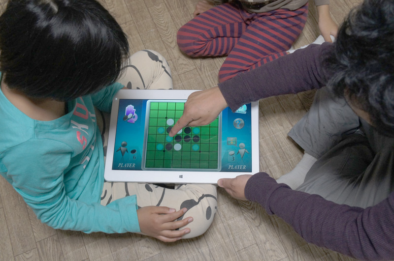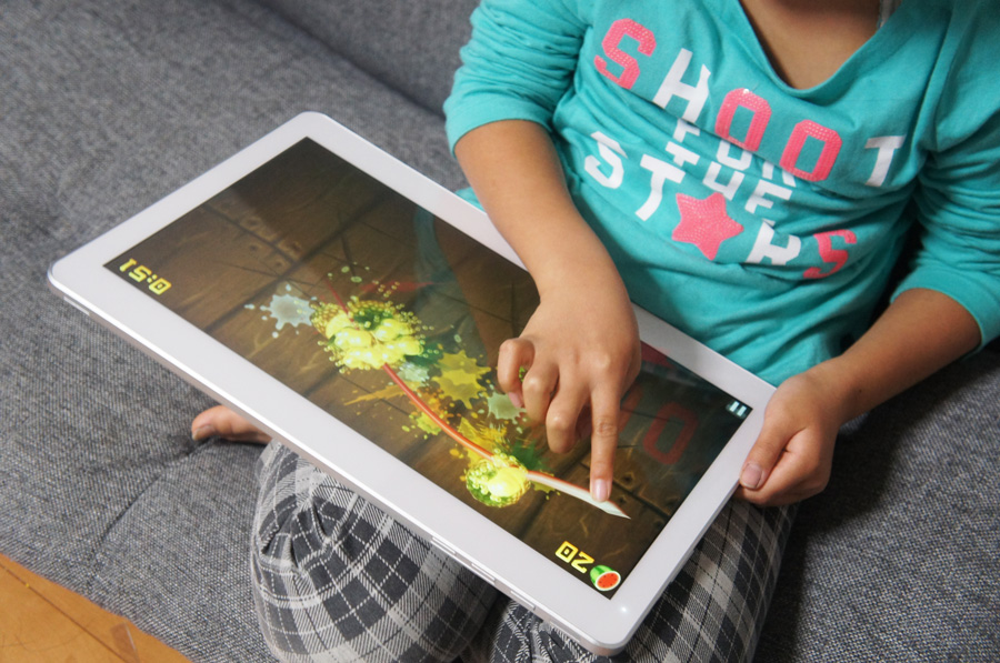 エアホッケーを2人でプレイしてみたが、こうしたゲームを2人で対戦するには、やはりこれくらいの画面の大きさが必要だと感じた。試しに同じゲームを8型液晶搭載Windowsタブレットでプレイしてみたが、2人でプレイするには窮屈であった。また、「Angry Birds Space」や「Fruits Ninja」といったスマートフォンでも人気のゲームを子ども達に遊ばせてみたところ、画面の小さなスマートフォンで遊ぶよりも、操作がしやすく、迫力があって楽しいとのことだ。また、将棋やオセロといったテーブルゲームも、画面の大きなGH77/Tなら非常に快適だ。画面の小さいスマートフォンでは、気をつけて操作しないと、動かそうと思っていた場所と違うところに駒を動かしてしまうことがあるが、GH77/Tならそうしたミスは起きない。
