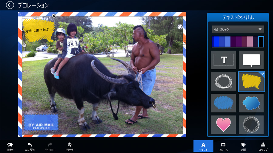 また、「My Cloudスタジオ」を利用すれば、写真の彩度や色調の調整をはじめ、不要な部分を取り除くことや、肌を滑らかにして美しく見せることもできるほか、プリクラのようなフレームを付けたり、吹き出しを入れるなどのデコレーションも可能だ。