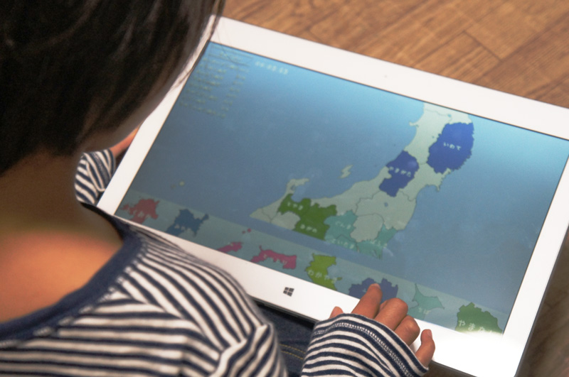 Windowsストアアプリにも「教育」というカテゴリがあり、幼児向けから中高生、社会人向けまでさまざまな知育アプリ、教育アプリが揃っている。試しに、息子に「小学生かんじ:ゆびドリル」を、娘に「日本地図パズル」をやらせてみた。