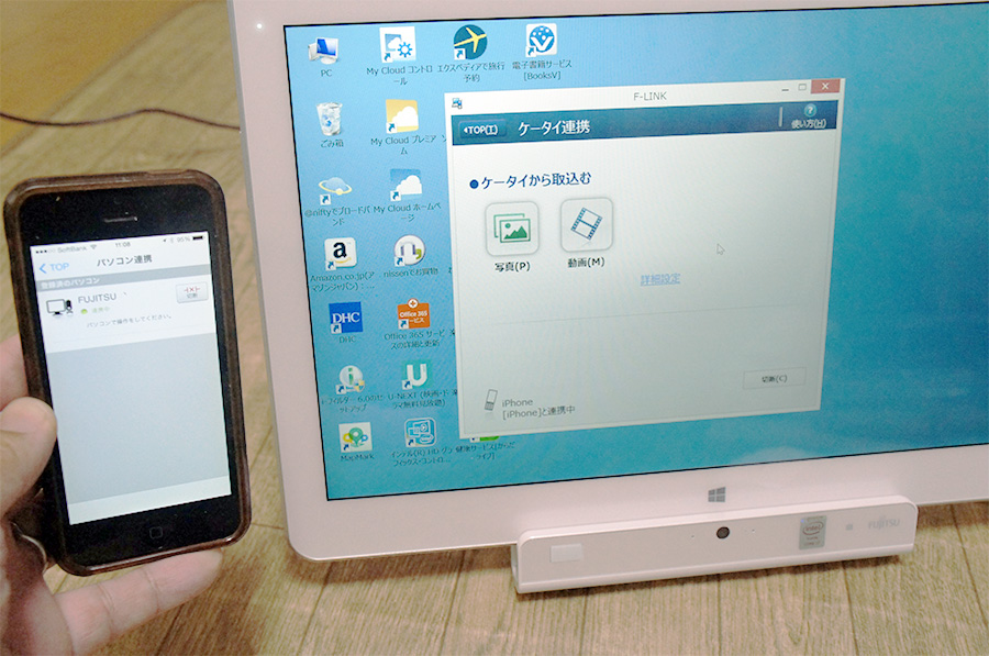 GH77/Tは、写真の取り込みも簡単。SDカードをSDカードスロットに挿入したり、スマートフォンを接続すると、「F-LINK」と呼ばれる写真/動画取り込みユーティリティが自動的に起動し、写真や動画の転送が行なわれる。写真や動画は全て転送することも、選んで転送することも可能で、重複分を自動除外してくれるなど賢い。