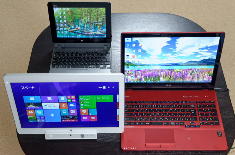 試した機種は、FMVの最新ハイパフォーマンスノート「LIFEBOOK AH77/U」、モニターと本体を切り離してタブレット的に使うこともできるNew Style PC「LIFEBOOK GH77/T」、2 in 1スタイルのタブレット「ARROWS Tab QH55/S」の3機種。