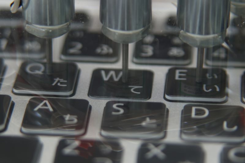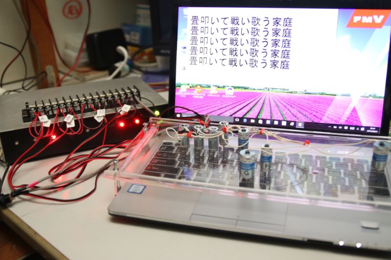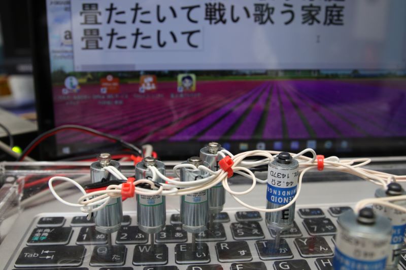その名も(ドラえも●の声で)「たた叩きマシーン」! 透明なアクリル板の上に載っている円筒状のものは、ソレノイドという電磁石。洗濯機が排水をするときにバン!と大きな音を立てて排水弁を開くが、それと同じ部品を使っている。ただ洗濯機用のヤツは超強力で、キーボードを叩くというより、マシンをブチ壊す感じ。そこでキーを指で叩く程度の優しいソレノイドを用意した。でもバンバン言う騒音は洗濯機に負けない(笑)。