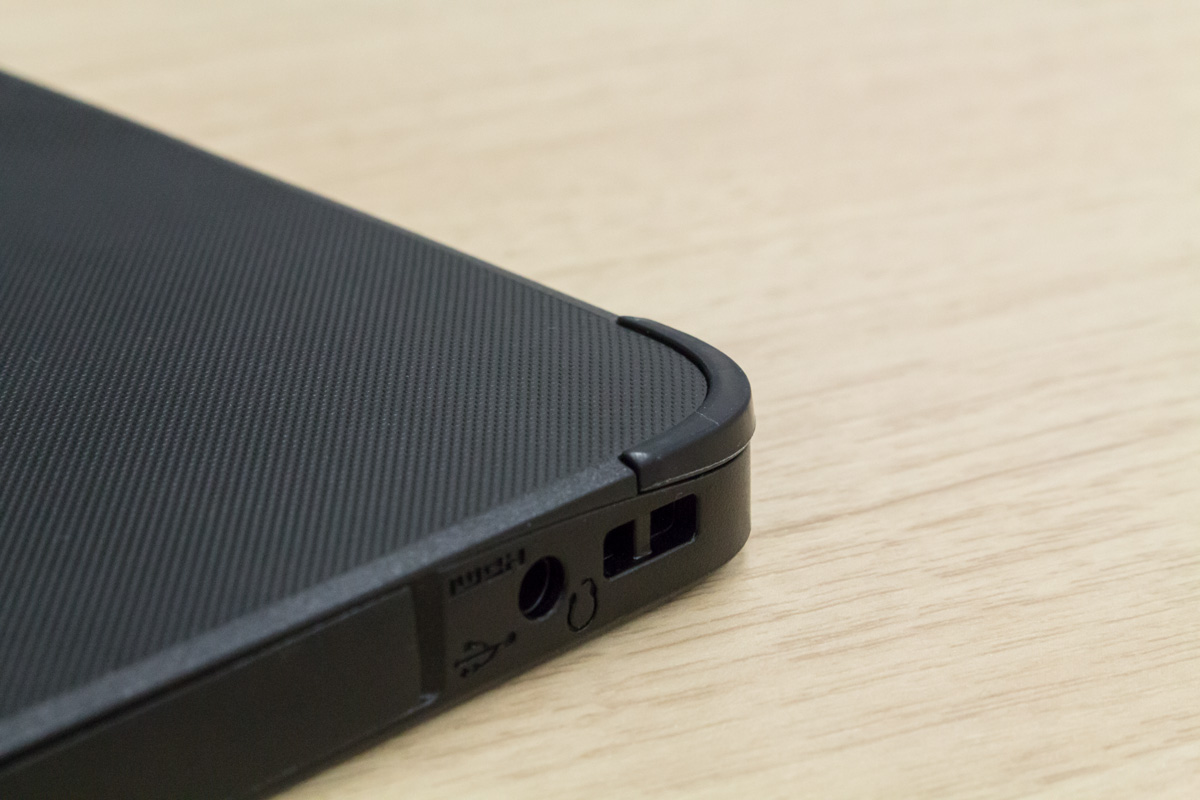 WQ2/B1の背面は丈夫かつ、すべり止めの加工がされている。また、四隅にはゴム系素材のグリップが装備されており、テーブルの上に乗せた際のすべり止めとして機能する。手に持っていても机に置いていても誤って落下させにくい、安心感のあるタブレットである。トドメとばかりにストラップホールまでついている