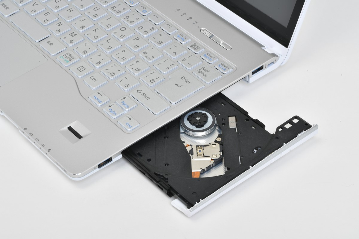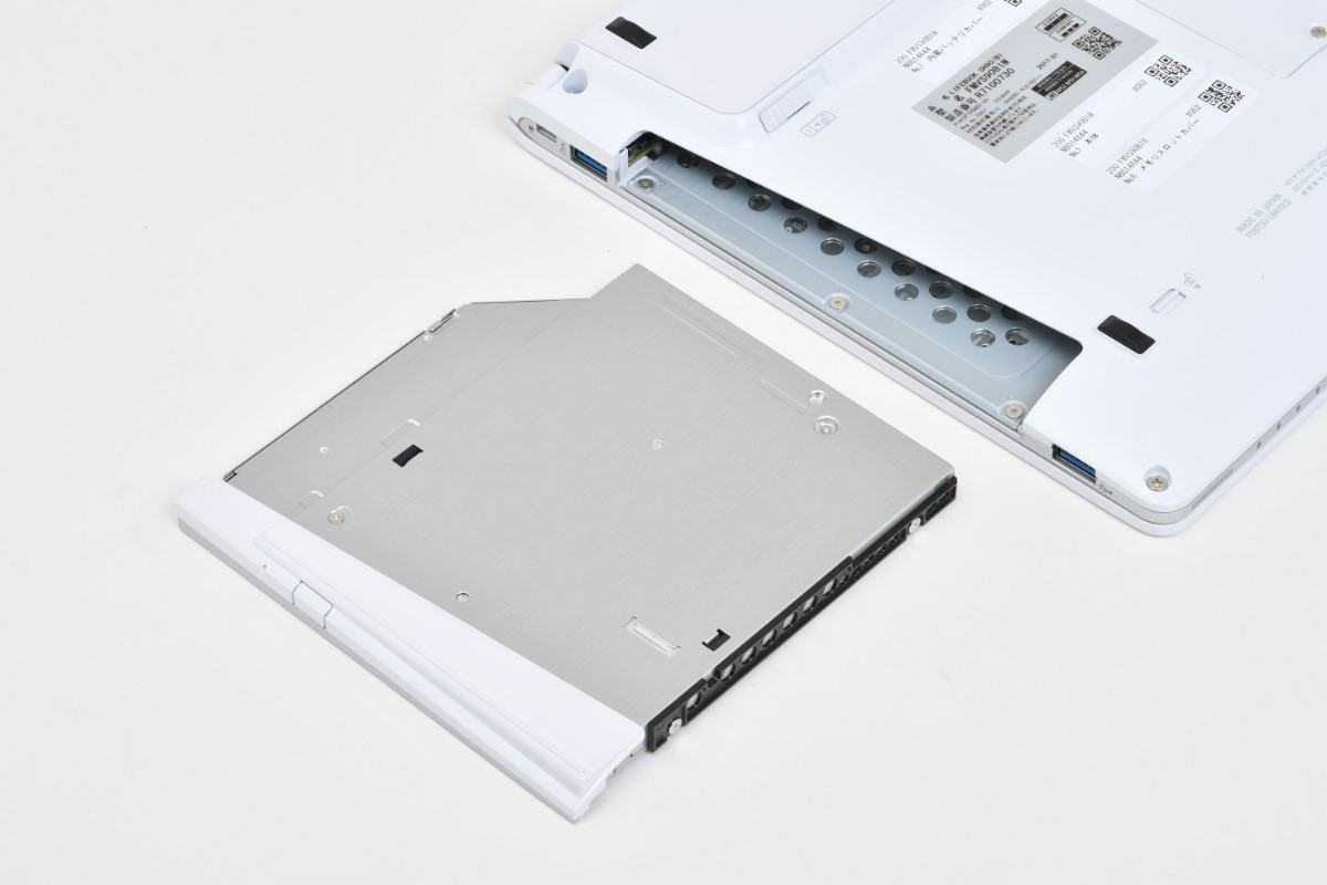 LIFEBOOK SHシリーズは、UHシリーズと同じ13.3型のモバイルPCだが、富士通のモバイルPCの中で、唯一光学ドライブを搭載するシリーズだ。搭載する光学ドライブは、店頭モデルはDVDスーパーマルチドライブで、WEB MARTのカスタムメイドモデルなら、BDXL書き込みにも対応するBlu-ray Discドライブを選択できる。