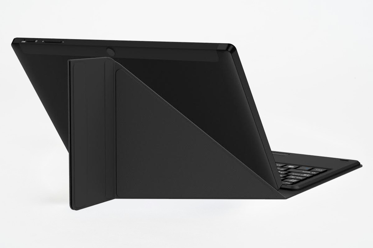 背面には引き出して使用するスタンドが付いている。カバーキーボードを付けていればノートPCのように使用できるし、外せばタブレット単体でも立てて使用できる