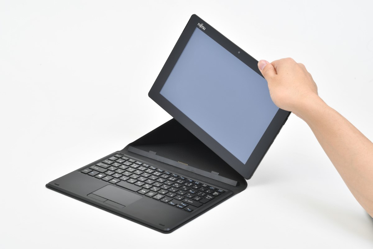 2 in 1タイプは液晶側が本体で、そこに専用キーボードを接続して使用する。持ち運び時はキーボードを閉じる(写真はarrows Tab RH77/B1)