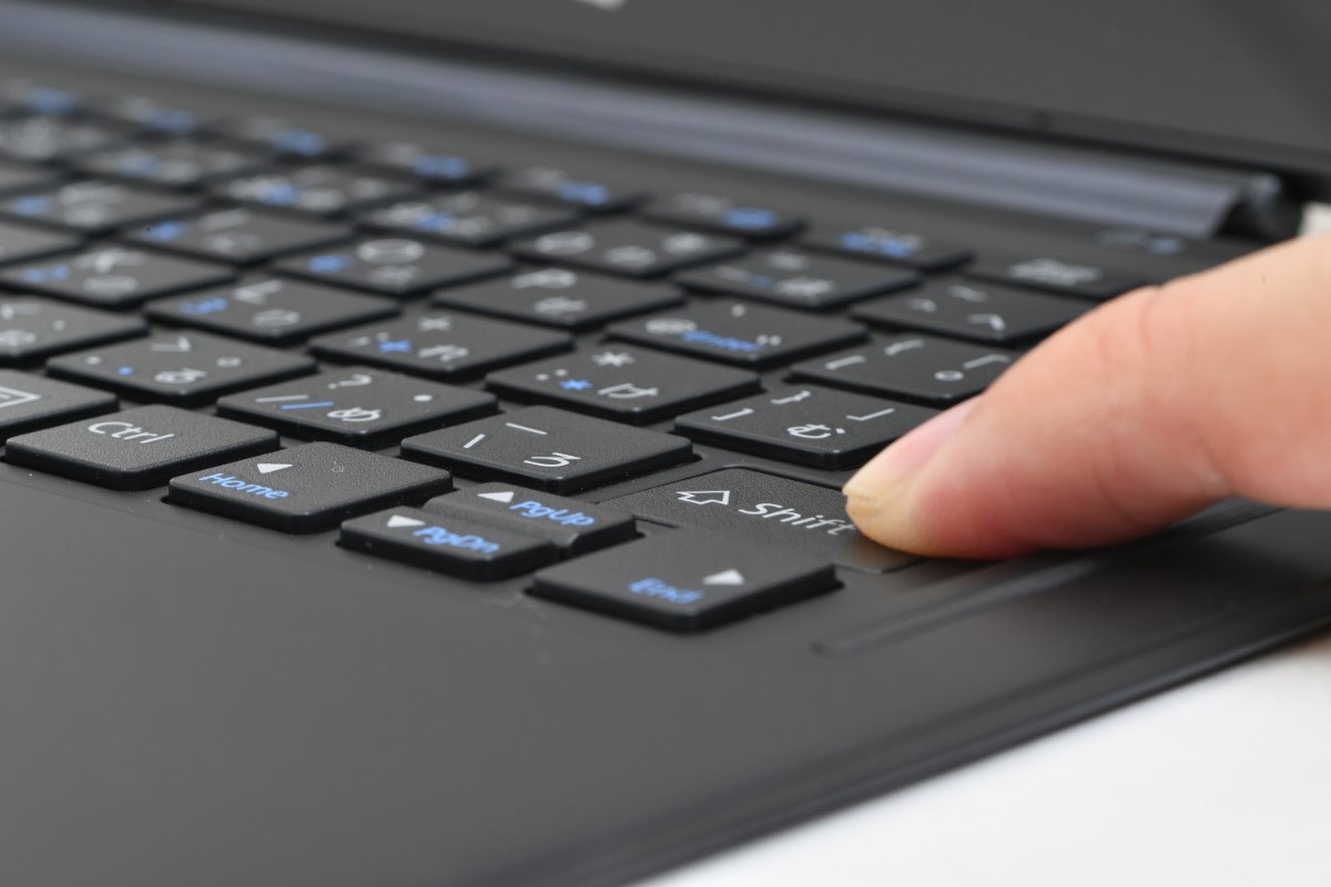 キーボードも打ちやすく、キーストロークは約1.2mm、キーピッチはフルサイズの約19mmを実現している。キーの重さが指によって異なるユニークな仕組みを搭載しており、指の力に合わせた2段階の重さで打ちやすいのだ。