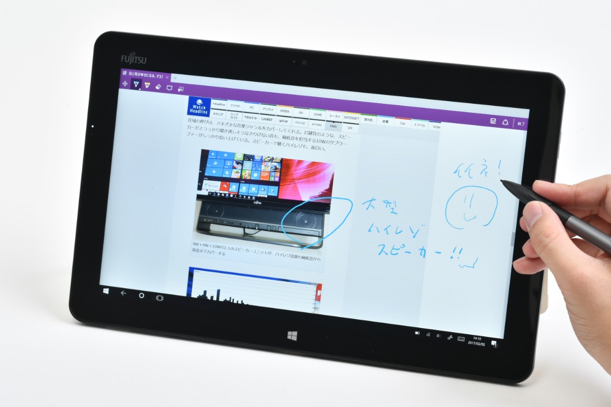 Windows 10は2 in 1に完全に対応しており、キーボードが付いている状態では通常のWindows 10として動作し、キーボードを外したときには自動でタブレットモードに切り替わる。タブレットモードでは画面インターフェースがタブレット用になり、キーボードやタッチパッドがなくても指やペンだけで快適に操作を行える。設定を変えれば、キーボードが付いていない状態でも通常のWindows 10として使うことができるので、自分に合った使い方を選べばいい。タブレットとして使う際もかなり完成度が高く、性能が良いのでサクサク動作するし、何の不自由さも感じない。付属のスタイラスペンを使用したペン入力は1024階調の入力に対応しており、手書きでメモをとったり、図を描いたりといったこともストレスなく行えるし、フォトレタッチやイラスト作成などのクリエイティブ用途にも活用できる。