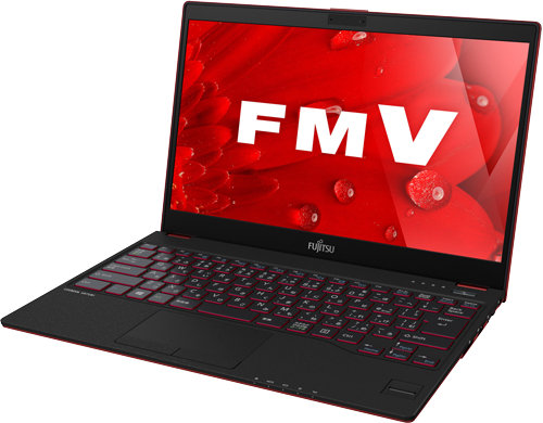 UH75/B1の本体カラーは2色あり、この記事で使用しているのが「ピクトブラック」、もう1つが「サテンレッド」だ。サテンレッドは、下地のブラックの上にシルバーを2回重ね、その上に赤を塗装する4層塗装によってかなりの高級感を出している。また、天板だけでなくキーボード部分の側面にも赤を配すことで、スタイリッシュさを増している。