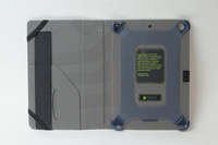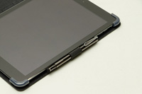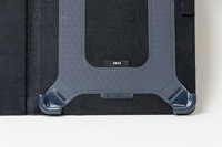 そしてこのiPadケースの最大の特徴は、内側の右のiPad自体を固定する部分、高度な耐衝撃性能を実現する特許取得済みの技術「SG Bumper」だ。比較的頑丈な皮革製のケースと、iPadの四隅で固定する樹脂製のバンパーの組み合わせにより、多少の落下であれば衝撃を緩和、吸収してiPad本体の破損を防いでくれる。具体的には、開いた状態で床に落としても、突起物がなければディスプレイ面に傷が付くことはなく、本体が故障することもないとのこと。ゴムバンドを使ってしっかりカバーを閉じた状態であれば、よりプロテクション性能は高まる。