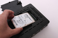 外付けドライブが邪魔という場合は、パソコン用の2.5インチシリアルATAのドライブを本体内に内蔵することも可能だ。取り付けは簡単で、「キオクのひきだし」の底にあるフタを開け、ハードディスクを差し込むだけでいい。取り付けは、外付けドライブ並みに簡単なので、内蔵ドライブをオススメしたい。