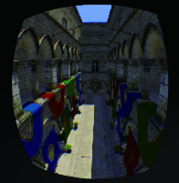 簡易的な拡大レンズをあてがっただけでは、見える映像は歪んでしまうわけですが、表示する映像側を、拡大レンズによる歪みを中和するような「逆歪み」を与える形で描画してしまうことでつじつまを合わせられます。