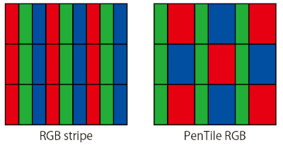 ペンタイル型とストライプ型とは、RGB(赤緑青)のサブピクセル構造の違いを表しています。ペンタイル型配列では、Gのサブピクセルは解像度ぶんありますが、RとBのサブピクセルは隣接するGサブピクセルに共有されるのです。逆にいえばGの色はフル解像度で再現されますが、RBの色は隣接するGから最大公約数的な駆動を余儀なくされます。端的にいえば、ペンタイル型配列のほうが解像感は落ちます。理論値で40%くらいは低下することになりますが、前述したように人間は緑色の解像感でごまかされがちなので視覚上はそこまでは低下しません。ただ、ストライプ型配列のほうが解像感に優れることはいうまでもありません。おそらく、Oculus RiftとHTC Viveは搭載映像パネルを2枚構成にしたことから、解像度に関しては妥協せざるを得なかったということなんでしょう。逆にPlayStation VRは表示品質・画質を重視したということだと思われます。