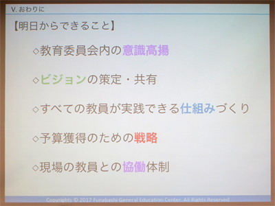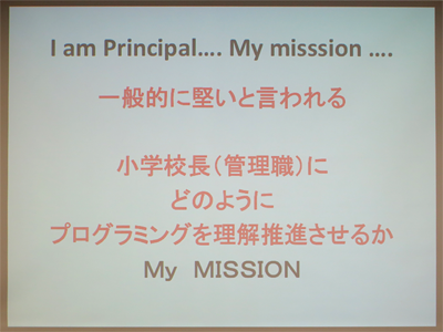 さらに、校長会においても自主研修会や管理職養成研修の場において、教科研究より教科・領域を超えた研究の方に価値があると力説する。校長自身も新学習指導要領を読み解くなど、積極的にプログラミング教育にチャレンジするべきだと訴えた。