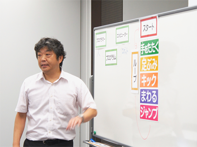 このあと、いよいよプログラミングを取り入れた模擬授業に入る。具体的にどんなことをすればよいのか悩む先生方にとっては最も興味のあるところだろう。プログラミングツールを用いた算数と、機器を使わないアンプラグド学習の2つの模擬授業が行われた。