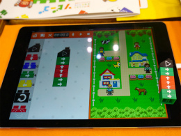 キャラクターが目的地にたどり着くまでに、どのようなプログラムを組み立てればよいのか。最初にブロックを並べて視覚的に考えながら、そのあとにアプリ内で同じプログラムを組んで実行し確認する。リアルブロックを用いて試行錯誤できることから、低年齢の子供が仲間とコミュニケーションを取りながら進めていきやすいのがメリットだ。ほかにも同セクションでは、小学校のプログラミング必修化を受けて、授業で使えるScratchの映像教材や組み立てロボットなど数多く展示されていた。