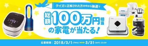 賞品には、新生活に役立つ土鍋圧力IH炊飯ジャー「GRAND X THE炊きたて(5.5合炊き)」(タイガー)、空気清浄機能付ファンヒーター「Dyson Pure Hot + Cool」(ダイソン)の床拭きロボット「ブラーバ」(アイロボット)などが用意されています。キャンペーン特設ページはこちら。