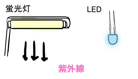 一般的な蛍光灯からはわずかな量の紫外線が出ている(放出する紫外線をカットした蛍光管もある)。微量なので、その紫外線が人体に悪影響を及ぼす心配はないと言われているが、ずーっと紫外線入りの光で照らされ続けた対象物にはイロイロな問題が出たりする。