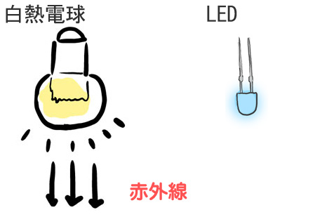 あと、光源が出す赤外線による室温上昇なども気にしなくてよくなる。白熱球いっぱい点けてるからこの部屋ミョーに暑いなぁ、的な問題がなくなるのだ。ただ、照明用LEDのような明るく光るLEDの場合、LEDが発する光からは熱が出ないものの、LED照明器具からは発熱する。LED照明器具を使っても、器具自体はわりと熱くなるので注意が必要ですな。