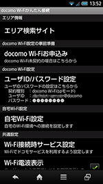 ドコモの場合、docomo Wi-Fi用のスマートフォンアプリ「docomo Wi-Fiかんたん接続」アプリが無料で提供されている。インストールしたらアプリを起動し、設定画面から契約種別を選んでspモードのパスワードを入力すれば設定は完了。あとはdocomo Wi-Fiエリアからボタン操作のみで簡単にdocomo Wi-Fiへ接続できる。なお、docomo Wi-Fiのエリアに入ると自動で接続する機能も2012年12月から提供が始まっており、アプリから簡単に自動接続の設定ができる。現時点で自動接続機能が利用できる機種は一部の機種に限られるが、自動接続機能に非対応の機種でも、ウィジェットをワンタッチするだけでdocomo Wi-Fiに接続することができる。