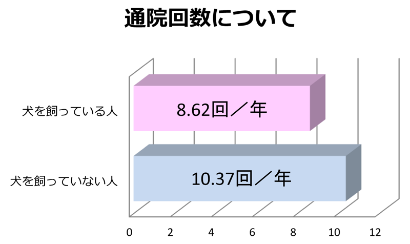 『日頃ストレスを感じている人』の通院回数が、犬を飼っている人のほうが少ない研究結果が出ています。毎年増加している国民医療費全体の抑制にもつながる重要なペット飼育の効用といわれています※参考資料:笑顔あふれる、ペットとの幸せな暮らし。(発行元:ペットとの共生推進協議会)出展・参考文献:シーゲル(Siegel,M.,Anderson,W.P.,1990)
