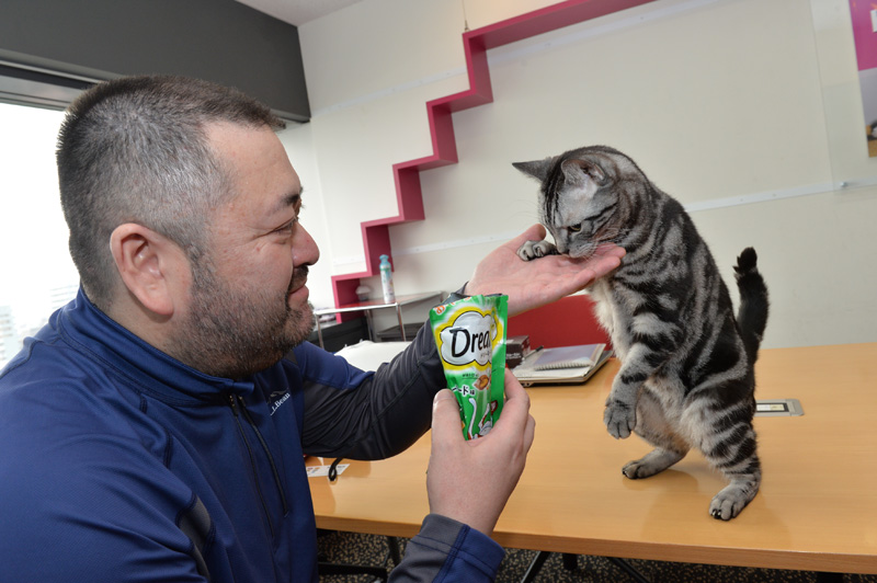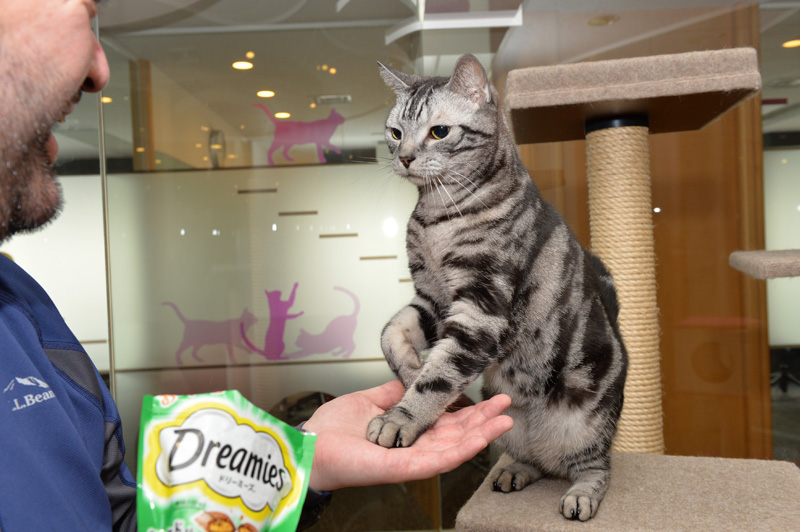 てな感じで、ヒッジョーにフリーダムに仕事場へと遊びにやってくるウィスカーくんと権之助くん。彼らが来ると、誰もが無条件で笑顔になっちゃいます。また、彼ら二匹に近づくマース ジャパン社員の方々も皆さん笑顔。猫パワーってやっぱり凄いな~、と痛感した体験でした。