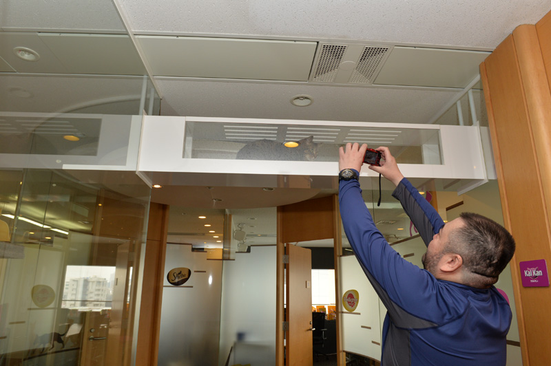 透明ガラスで中が見える猫様住居スペースの近くには、打ち合わせ用の部屋がいくつかありました。そしてナンと!! その部屋のひとつにはマース ジャパン猫様が自由に出入りできるんだそうで。猫専用ルームとその部屋は、猫用通路で接続されているんです。