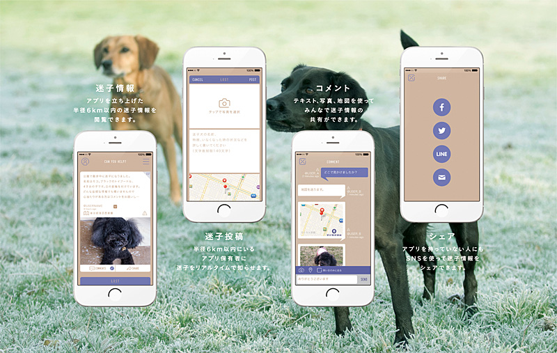 そんな悲しい現実を減少するために開発されたのがFINDOGです。犬が迷子になったとき、半径6km以内のアプリ保有者に迷子を知らせることができます。地域に存在するペット仲間たちの「やさしい気持ち」をアプリでつなぐことで、迷子発見に役立てるしくみとなっています。実際に犬を飼っていない人でも参加できるので、アプリ保有者が増えるほど、迷子の犬の救出につながります。