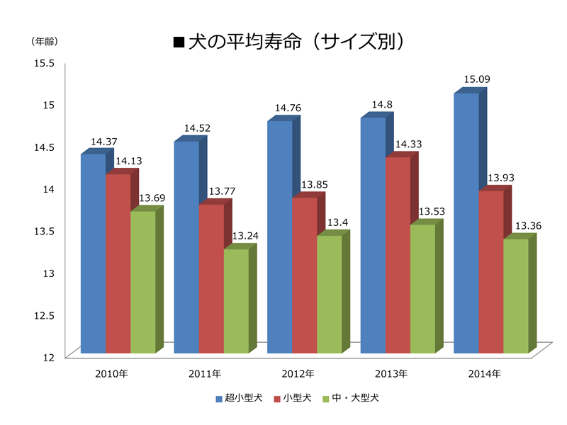 ※犬全体には、「サイズ不明」を含みます。平均寿命算出元データは「(一般世帯で)過去10年間に飼育された犬」のため、野良犬、ブリーダーやショップで死亡した犬は算出対象に入っておりません。