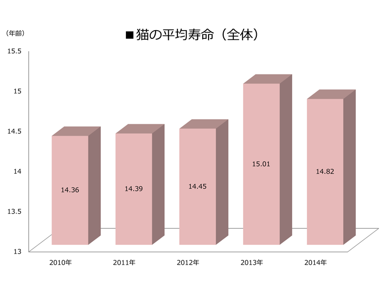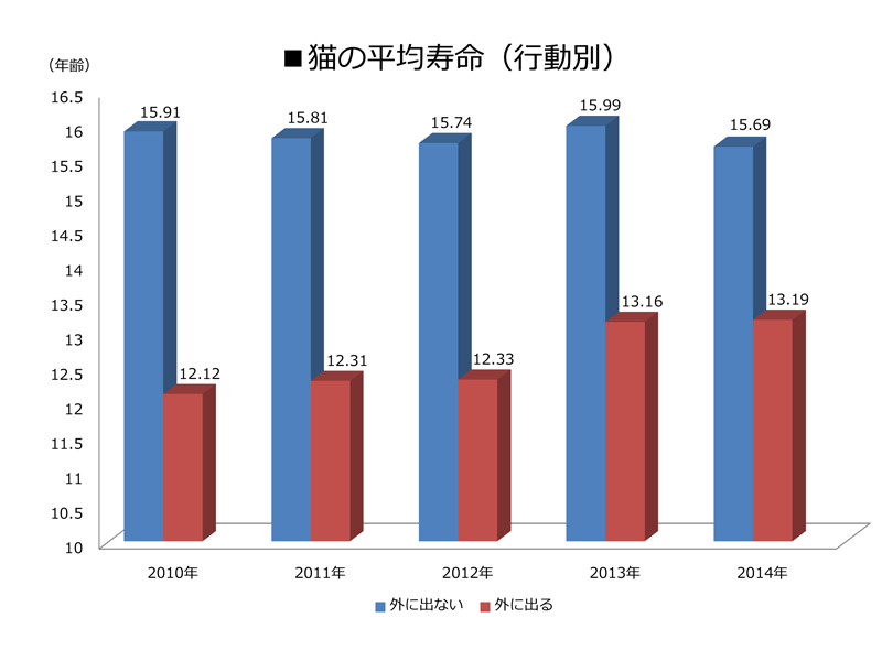 ※猫全体には、「ふだん家の外に出るか否か不明」を含みます。平均寿命算出元データは「(一般世帯で)過去10年間に飼育された猫」のため、野良猫、ブリーダーやショップで死亡した猫は算出対象に入っておりません。