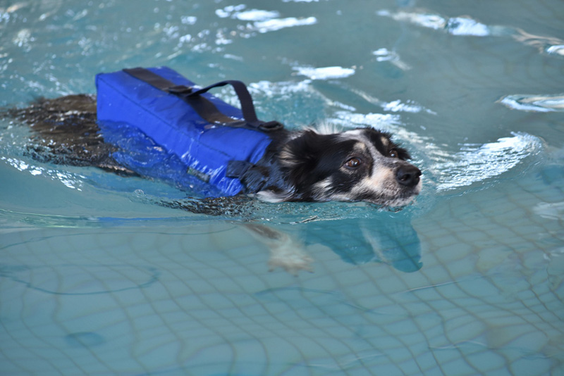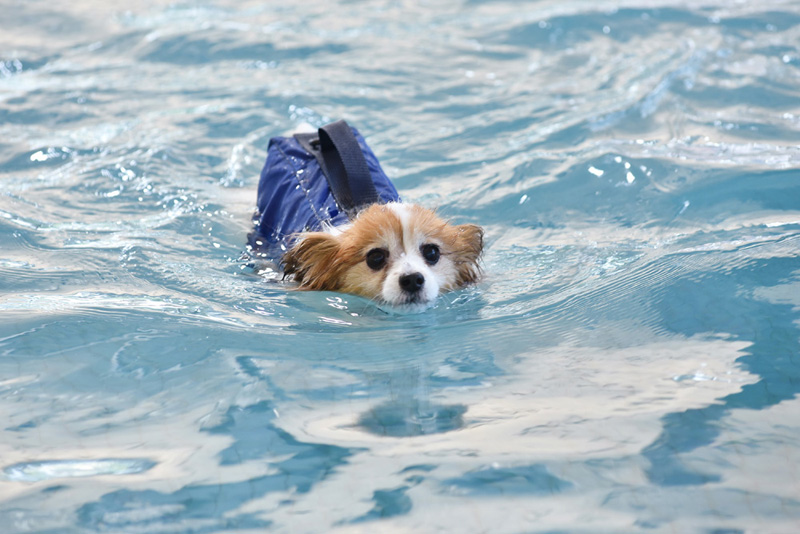 水の力を利用したストレッチです。水泳が苦手な犬でもリラックスしながら体を伸ばすことができます