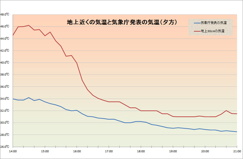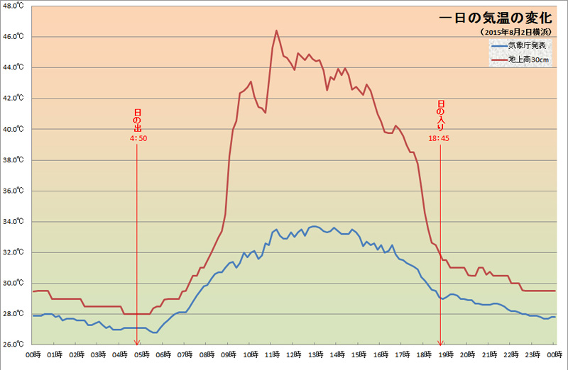 なお参考になればと思い、地上30cmの1日の気温の変化を測定してみたのが次のグラフだ。
