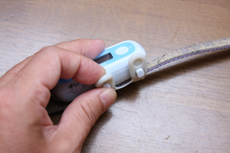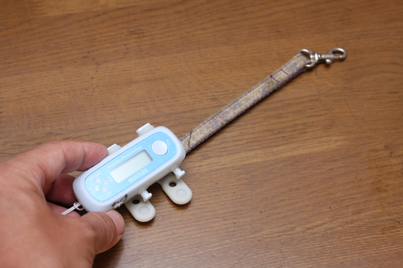 ヒトが持ち歩く場合は、付属のキーストラップを使うといいだろう。このストラップは、ワンちゃんのリードにも使えるのだが、ウチの定吉くんはブラブラするのが気になるらしく嫌がっていた。なのでウチでは、ヒト用に使っている(笑)。