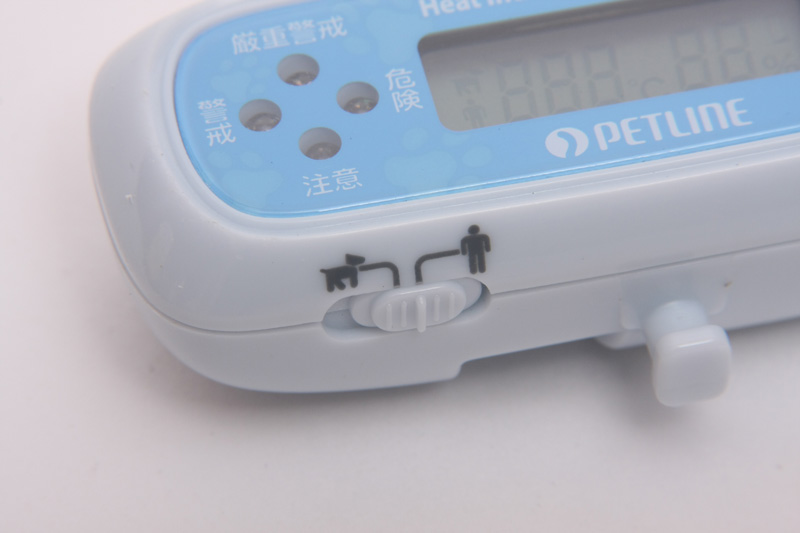 この製品の特徴とも言えるのが、スイッチひとつでヒト用の熱中症チェッカーになるところだ。これは医者から聞いた話だが、ヒトも歳をとってくると暑さや寒さを感じるセンサーが鈍ってきて、ついつい暑い中でもエアコンを付けずに過ごしてしまいがちだという。そんなときにこの熱中症チェッカーを使えば、光と音で知らせてくれるので便利だ。