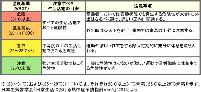 ペットの場合は3段階だった基準も、ヒトの場合は4段階になっている。熱中症予防の国際的な基準WBGTに基づいていて、日本の環境省でもこの基準を元に熱中症予防の注意を訴えている。