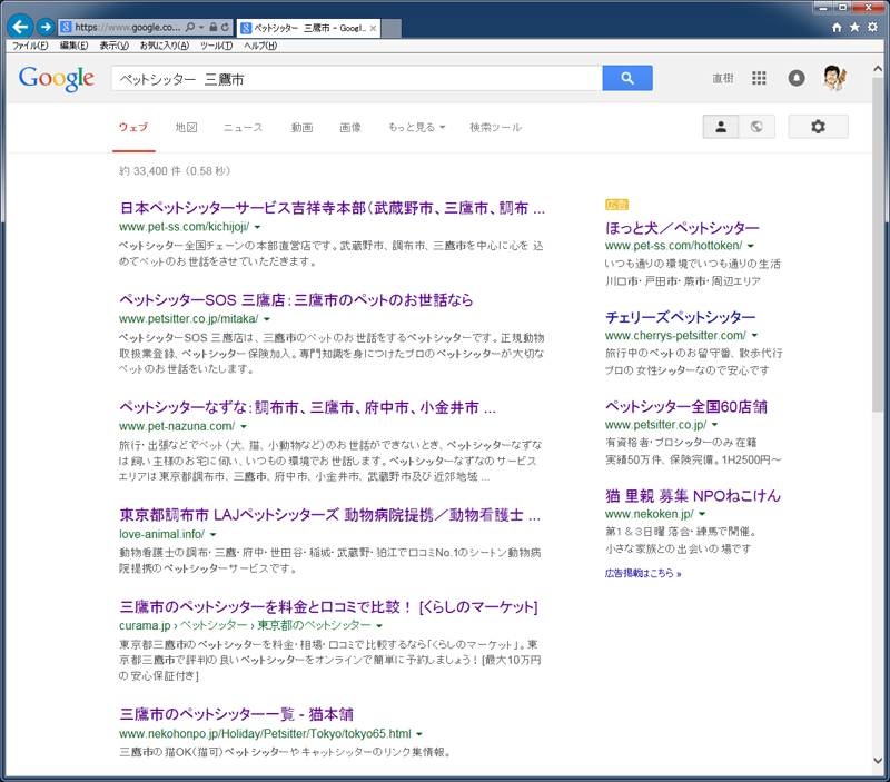 以前に近所の電信柱に「ペットシッターやります」との張り紙を見たことがあったけれど、もちろん覚えていない。できれば近所でペットシッターを探したい。ということで、とりあえず「ペットシッター」「三鷹市」のキーワードで検索してみる。