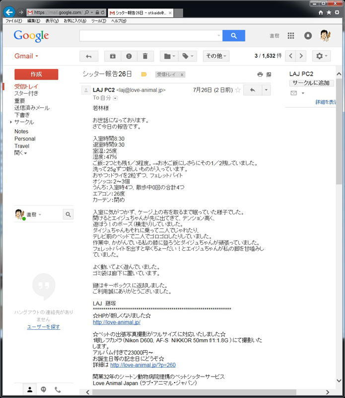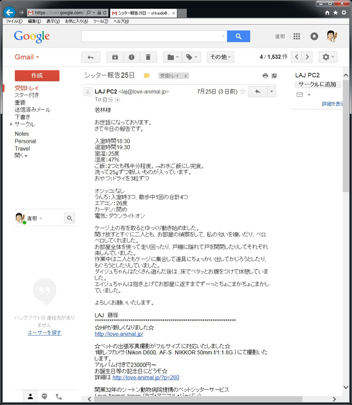 京都に着くと夏休みということもあり、いつも以上にたくさんの観光客! まずはお寺に行って親戚と合流して法事をすます。それから親戚と会食して夕方になると、突然のようにわが子たちが心配になってくる。ちょくちょくメールが来ないかと気になる気になる(笑) たしかメールが来るのは全部仕事が終わってからで、ペットシッターを利用する飼い主さんたちに順次メールを送るとのことだから、夜8時以降になるとは聞いていたのだけれど。そして、遂に20時過ぎてメールがやってきた!