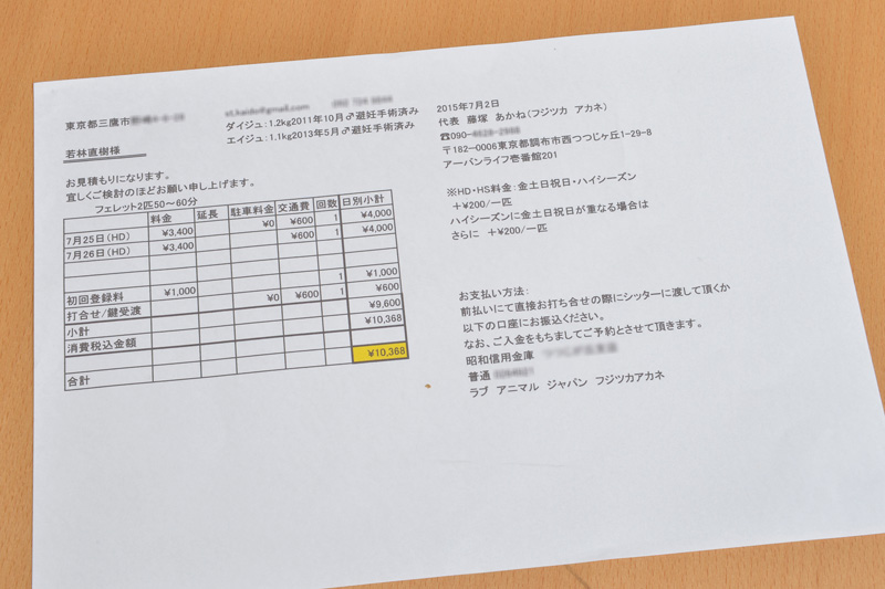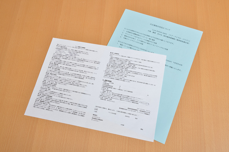 下の写真をご覧になっていただくとわかるが「ペット飼養代行確認書」なるもので細かい決まりごと(免責事項を含む)の説明を受け、必要項目を書き加えサインするのだ。そして、お坊ちゃまたちが通うホームドクターの連絡先も記入するので、もし体調が悪くなった場合にも対応してもらえるし、災害時の対応もしっかりしている。