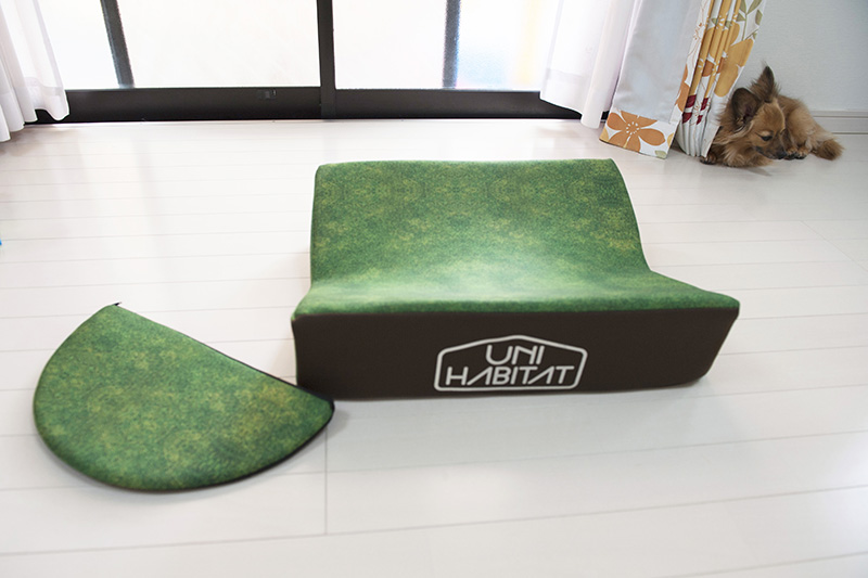 ということで、愛犬専用のソファ的なものはないかな、と探していたところ、よさそうなベッドタイプを見つけました。“愛犬が飼い主の太ももに挟まったような感覚”が得られるという、ユニハビタットの「ゲルに挟まるやわらかベッド」です。その感覚は犬にしかわかりませんが、体にもやさしく、気持ちよく、夏場はひんやり過ごせるなら、とさっそく試してみました。