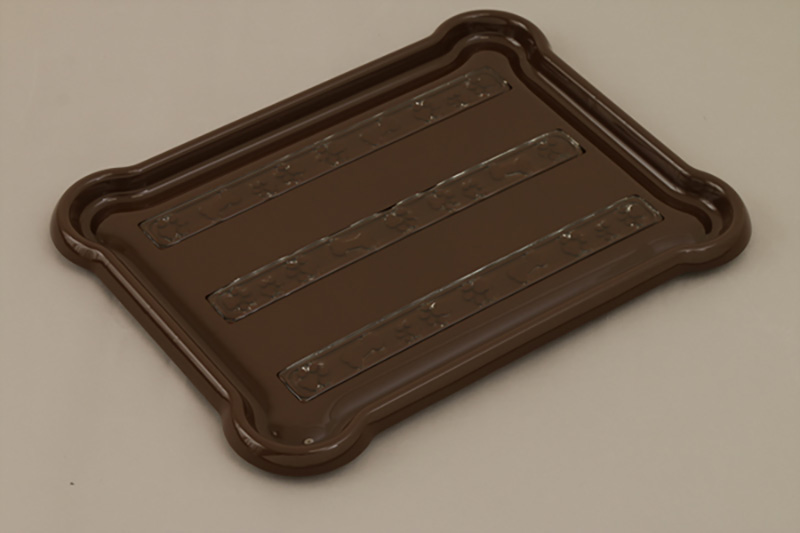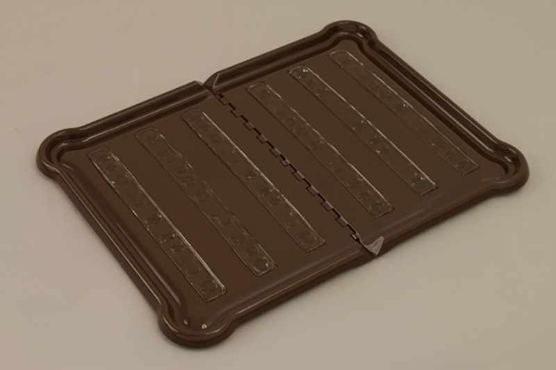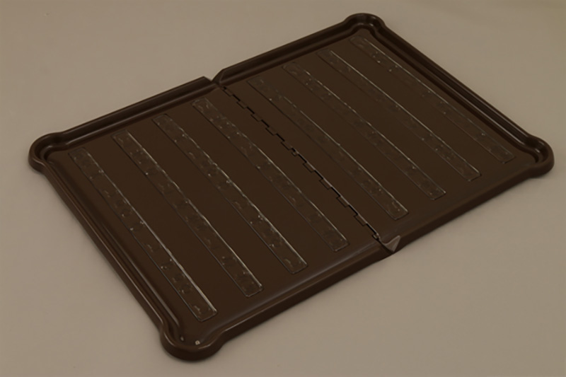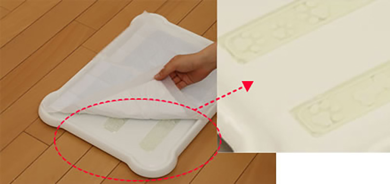 従来のペット用トイレはシーツの上から外枠で押さえて、シーツを固定するのが一般的でしたが、トレー表面に施した特殊な粘着剤を使用することで、面倒な外枠を装着することもなく、シーツを載せるだけで簡単に固定することができます。そのため「使用済みのシーツをはがすだけ」「新しいシーツを置くだけ」の2ステップで簡単にシーツが交換できます。