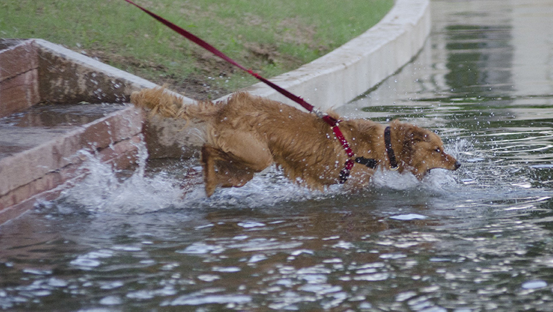涼しい時間に散歩に行くなど、外出時の気配りも大切です。人間と比べて体高が低く、お腹や胸、頭が地面に近い犬は、路面の熱を直接全身に受けてしまいます。地面に近づくと風が弱まる場合も多いですし、直射日光にあぶられた舗装路では、肉球をヤケドして腫れたり水ぶくれができたりが容易に起こります。