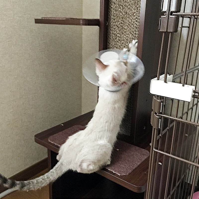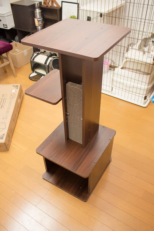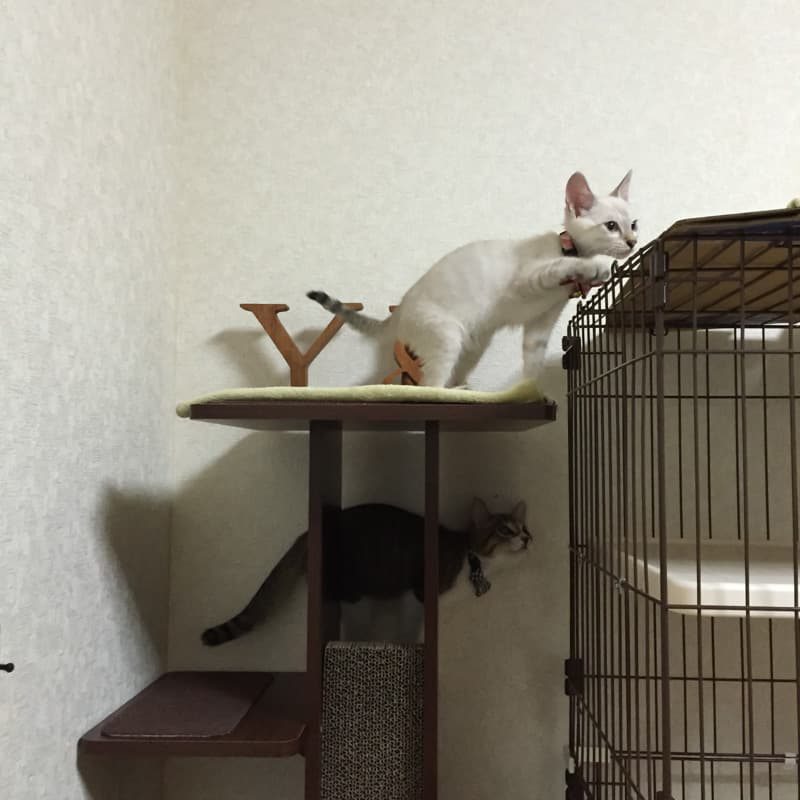 わが家は階段があるので上り下りの運動は足りていますが、マンションなどの室内飼いで愛猫の運動量が足りない場合には、こうしたコンパクトなキャットタワーを導入してみるのがいいのではないでしょうか。
