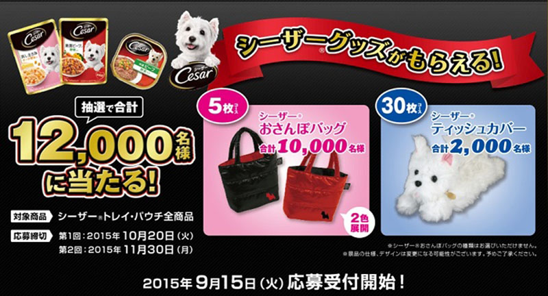 30枚コースでは、シーザー®ブランドでお馴染みのウェスト・ハイランド・ホワイトテリアのぬいぐるみのオリジナル「ティッシュカバー」に、5枚コースでは、愛犬との散歩にぴったりのウェスティのシルエットがかわいい「おさんぽバッグ」に応募できます。