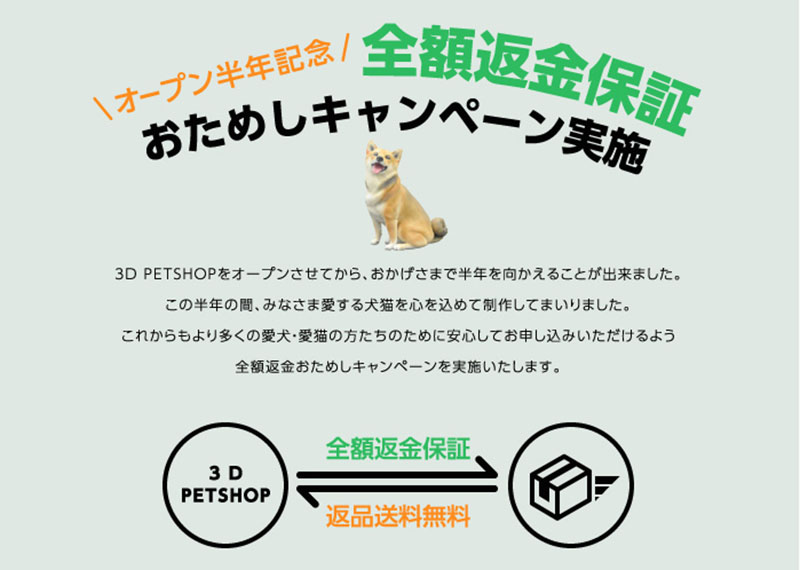 そんななか、愛犬と愛猫の3Dプリントフィギュア制作を手掛ける3D PETSHOPでは、オープン半年を記念して「全額返金保証おためしキャンペーン」を10月31日(金)まで実施中です。