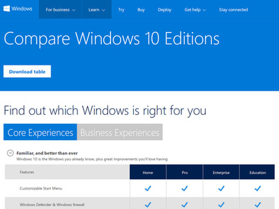 Microsoft、Windows 10のエディション別比較表を公開 ~Enterpriseのみ機能更新プログラムを適用させないことが可能