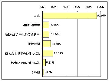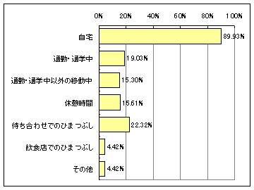 携帯用ゲーム機の使用シーンは、Watch読者・gooリサーチとも、90%程度が「自宅」だった。Watch読者のほうが「通勤・通学中」や「通勤・通学中以外の移動中」と回答した人が若干多かったが、自宅で使っている人が予想以上に多かった。最近、電車内でプレイしている人を多く見かけるようになったが、実はほんのごく一部だったということか。