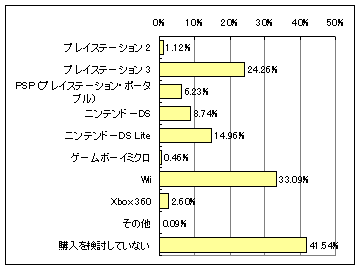 3」をすでに所有し、「Wii」は10%に迫る勢いだった。gooリサーチでは「プレイステーション 3」が約1.6%、「Wii」が約3.5%であり、Watch読者の関心の高さが顕著にあらわれている。