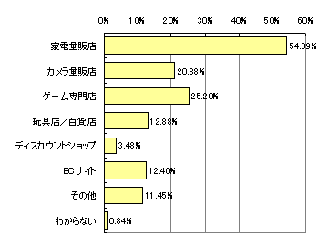 家庭用ゲーム機の購入場所は、Watch読者・gooリサーチの両方で、「家電量販店」が半数以上を占めた。Watch読者で目立つのは、ECサイトの利用が約12%もあり、gooリサーチの約3%と大きく違いが出た。またWatch読者は、玩具店・百貨店よりもカメラ量販店やゲーム専門店での購入が多かった。