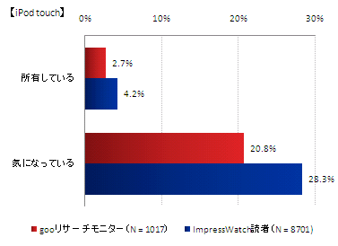 携帯電話で各種機能をまとめて利用する意向 iPod touchの所有率は3%、2割の人は“気になっている”最後に、2007年の9月に発売されたiPodシリーズの最新作である「iPod touch」の現状を聞いてみた。すでに所有している人は3%とわずかであるが、2割の人が現在気になっている電子機器と答えている。また、所有率はWatch読者でも4%と大差はない。 ※iPod touch・・・音楽再生に加えて、画像や動画の再生機能、ゲーム機能、無線LAN機能の搭載によるウェブサイトの閲覧が可能など、従来のデジタルオーディオプレーヤーに比べて多機能であり、マルチタッチと呼ばれる独自のユーザーインターフェースを持っている。